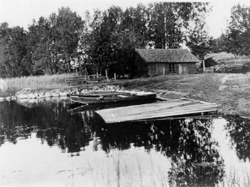 Strandparti vid Aranäs gård. En liten stuga och en eka som ligger vid stranden.