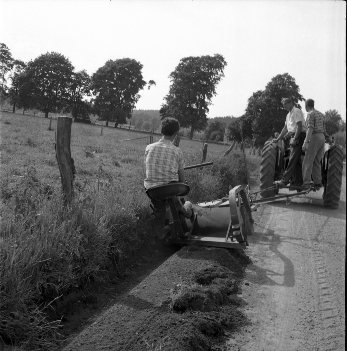Två män står på en traktor. De dikar en lerväg. En man sitter på grävskopan som gräver ut diket.