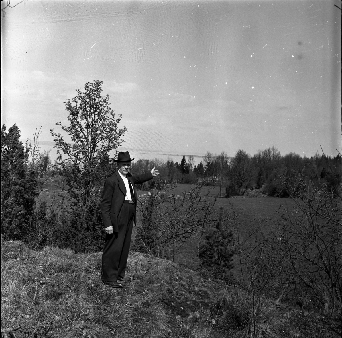 En man står på en bergskulle. Han gestikulerar med armen mot ett landskap där en ny motorväg ska byggas.