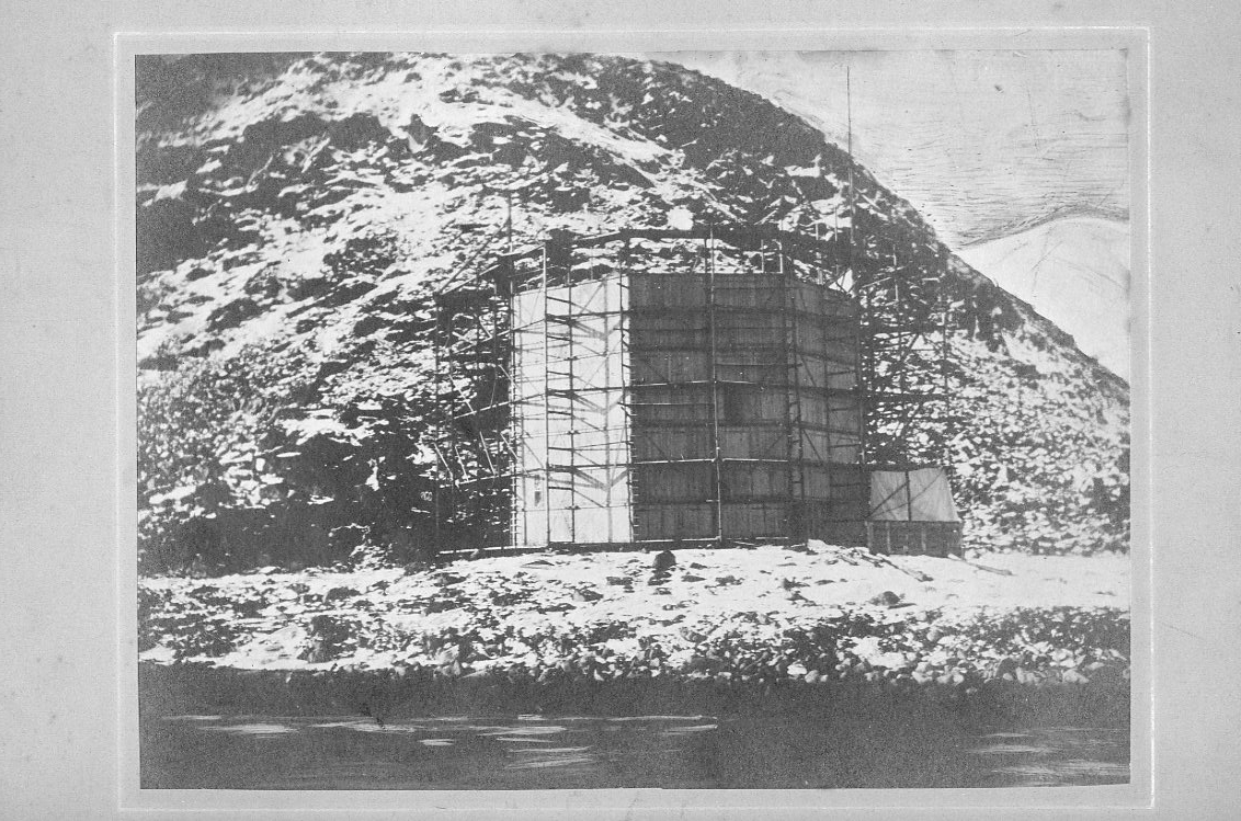 Ballonghuset på Danskön. Det ligger lite snö på marken och på fjället.