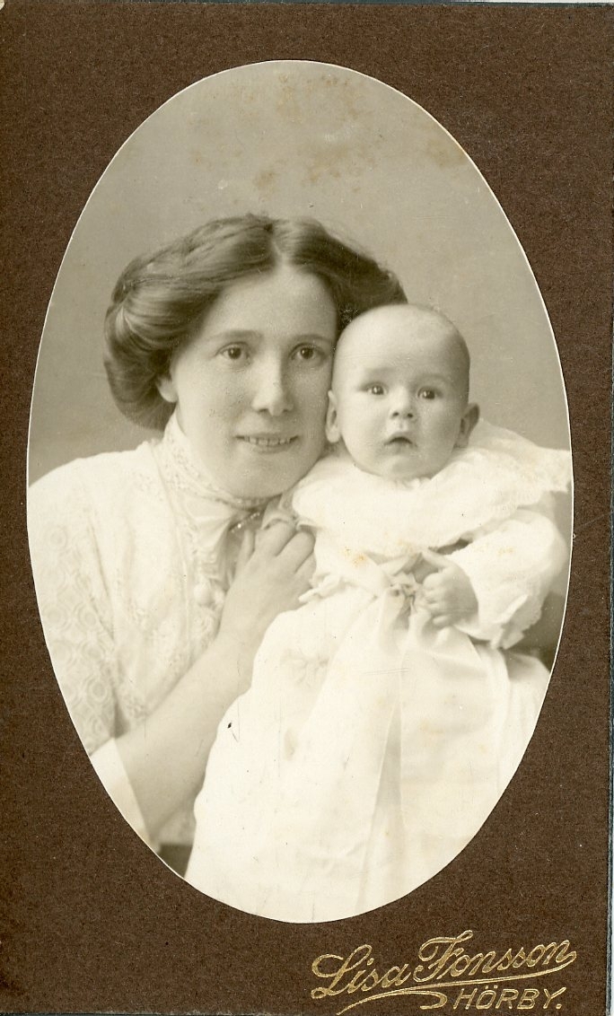 Kabinettsfotografi av en ung kvinna med ett spädbarn intill sin kind.