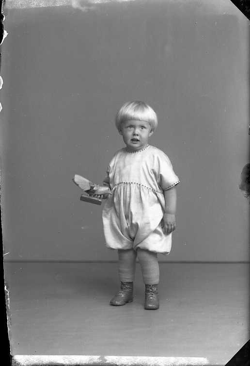 "Gossen Rahm", en liten ljushårig pojke som håller en träfågel i handen.