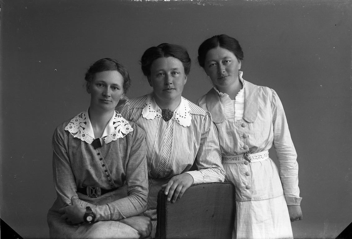 Gruppbild med tre kvinnor som sitter/står intill varandra. En av dem är fröken Erlandsson i Gränna.