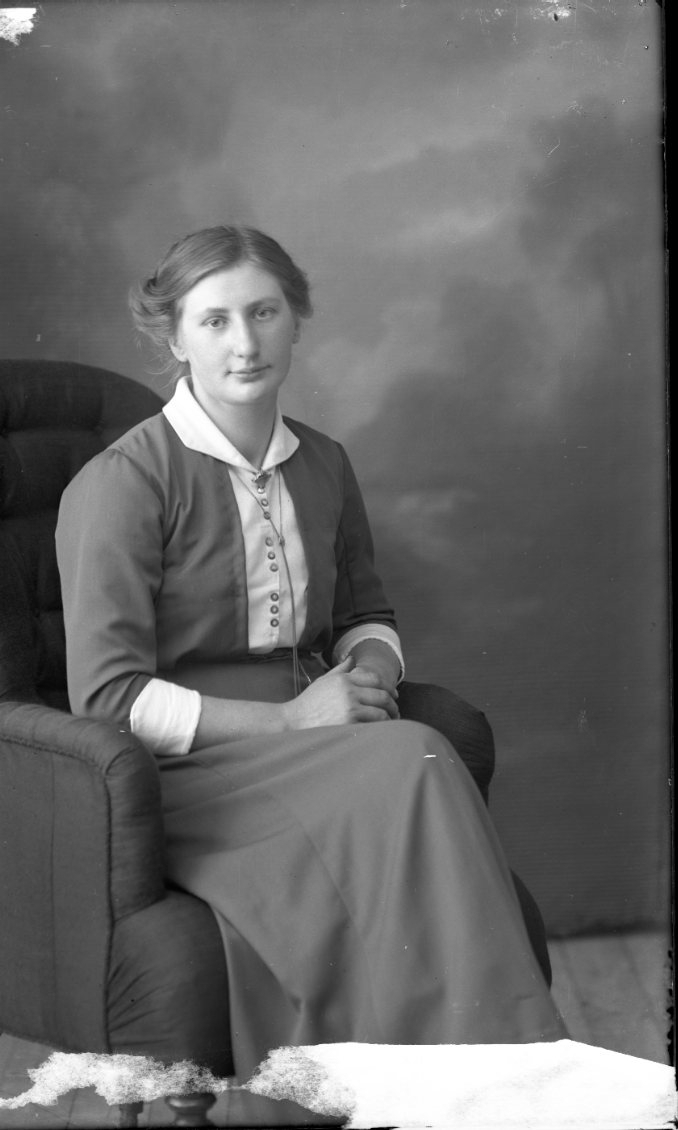 Porträtt av en ung kvinna som sitter i en fåtölj.