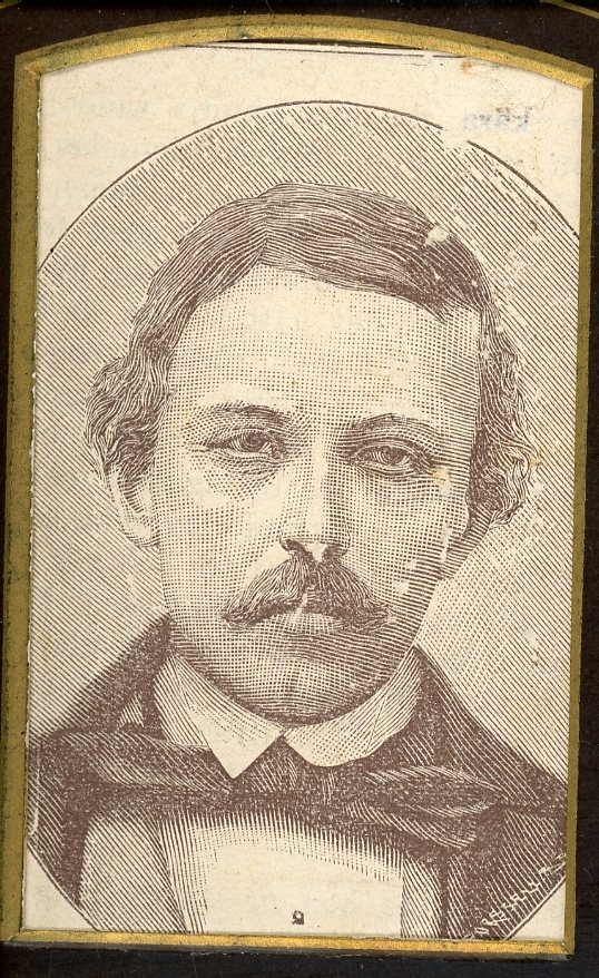 Kabinettsfotografi av ett tryck föreställande en ung man med mustasch.