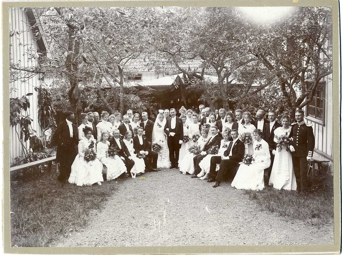 Ett brudpar med gäster står i en trädgård. På farstun bakom dem hänger bland annat en unionsflagga och stjärnbaneret.