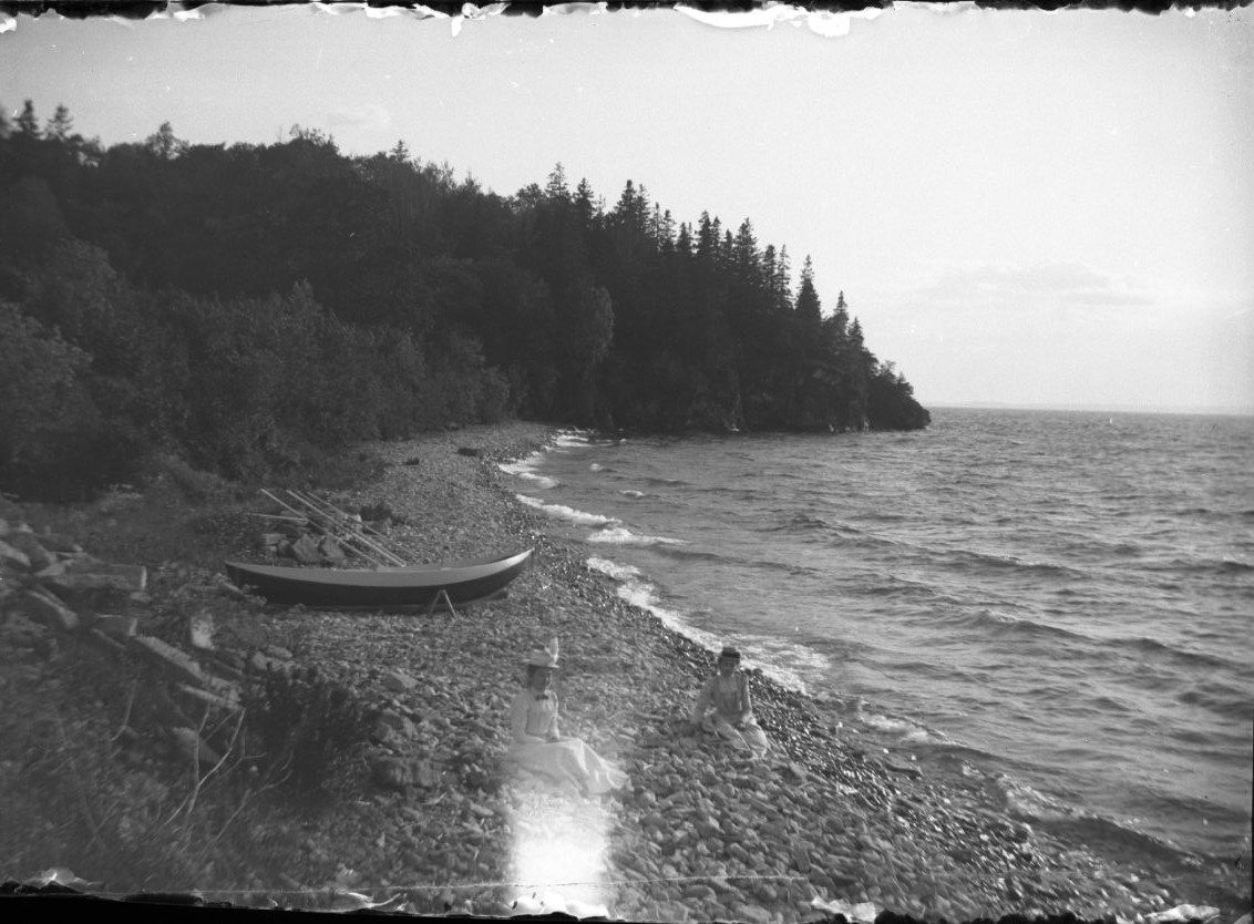 Två unga kvinnor i hatt och ljusa dräkter sitter på en stenig strand. Bakom dem ligger en eka uppdragen på stranden.