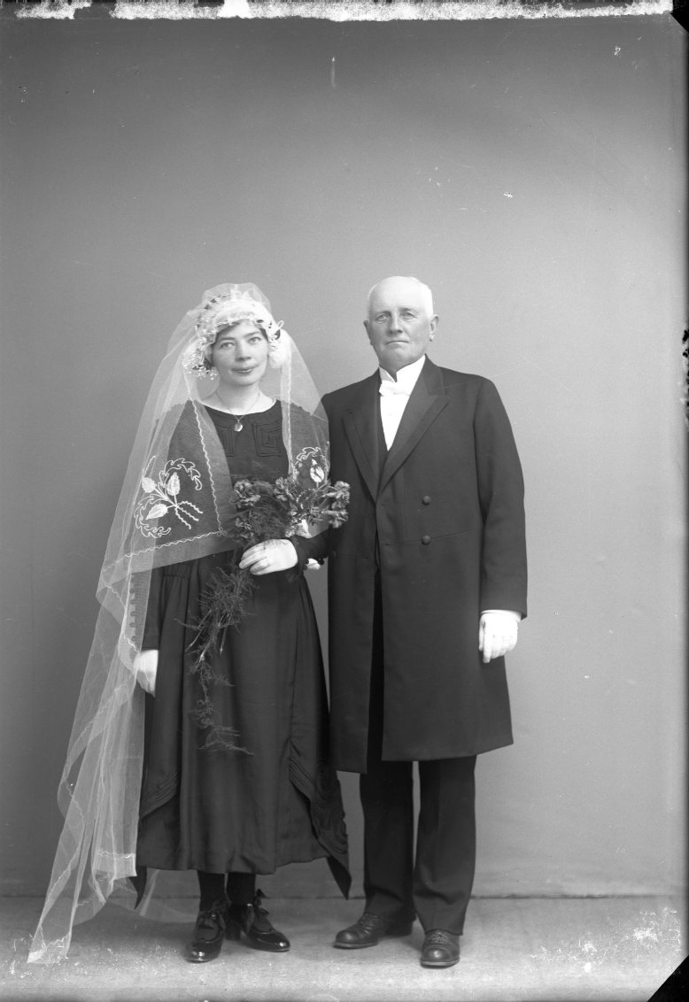 Ett brudpar. En yngre brud och en äldre brudgum vid namn August Pettersson.