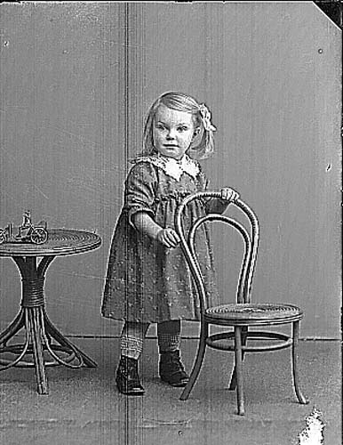 En liten flicka står vid en barnmöbel, håller i en stolsrygg. På ett bord står det en leksaksbil.