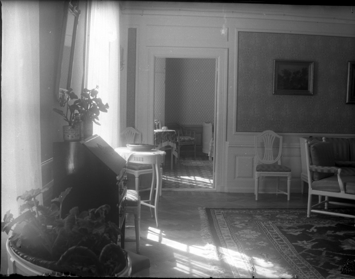 Interiör från Borgmästargården, nedre plan. Stilmöbler, matta på parkettgolv.