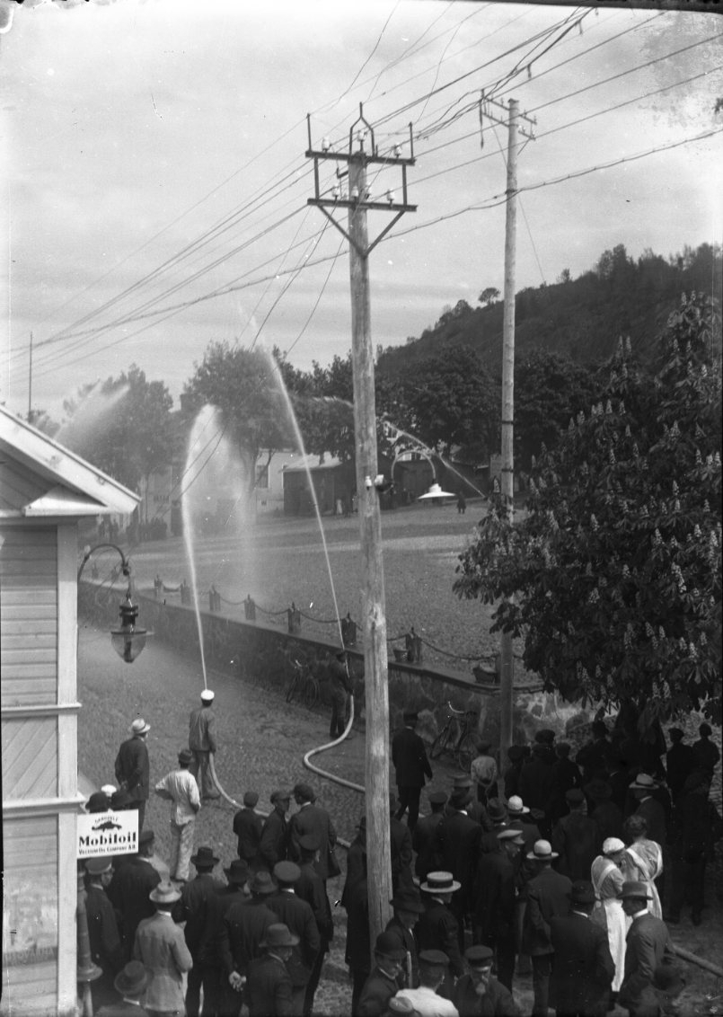Titel: Brandövning på Brahegatan nedanför Gränna torg. Två män sprutar norrut med vattenslangar. En folksamling, i huvudsak män, står bakom och tittar på. På husknuten till Brahegatan 41 sitter en skylt: Mobiloil.