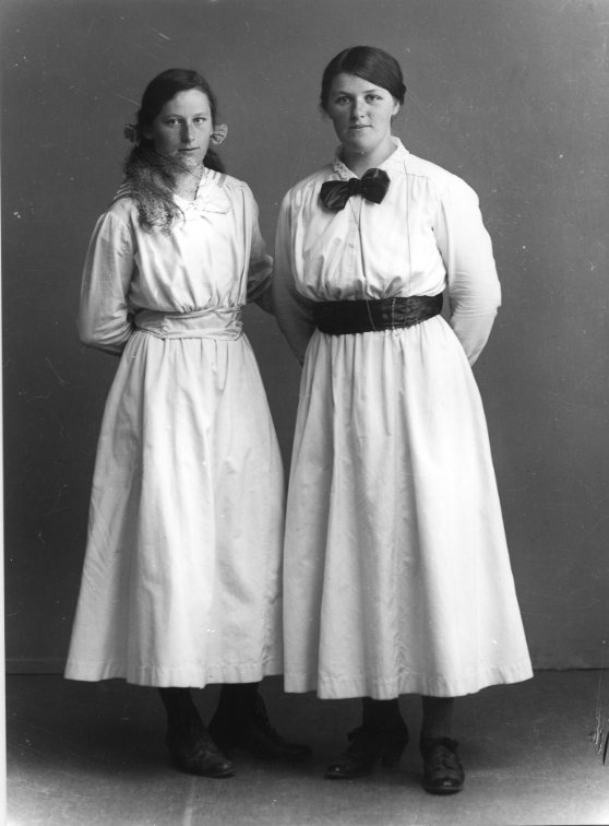 Två flickor i övre tonåren, i ljus klänning, ljus respektive mörk rosett vid kragen och motsvarande band om midjan.