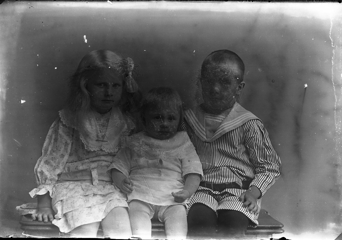 Gruppbild med tre barn - barnen Rydeman på Visingsö.