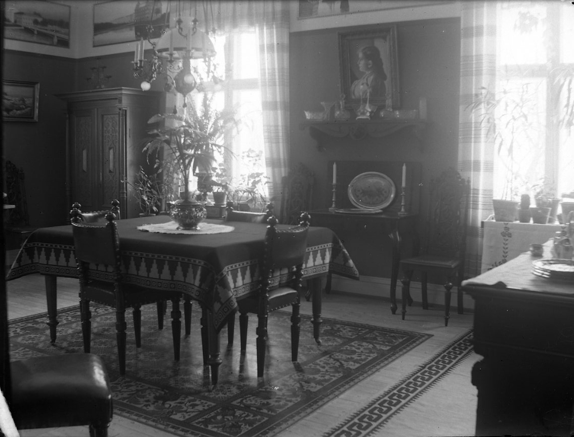 Interiör från fru Berta Bergins hem i Gränna. Mitt på golvet ett kvadratiskt bord med duk och fyra stolar, står på en mönstrad linoleummatta,