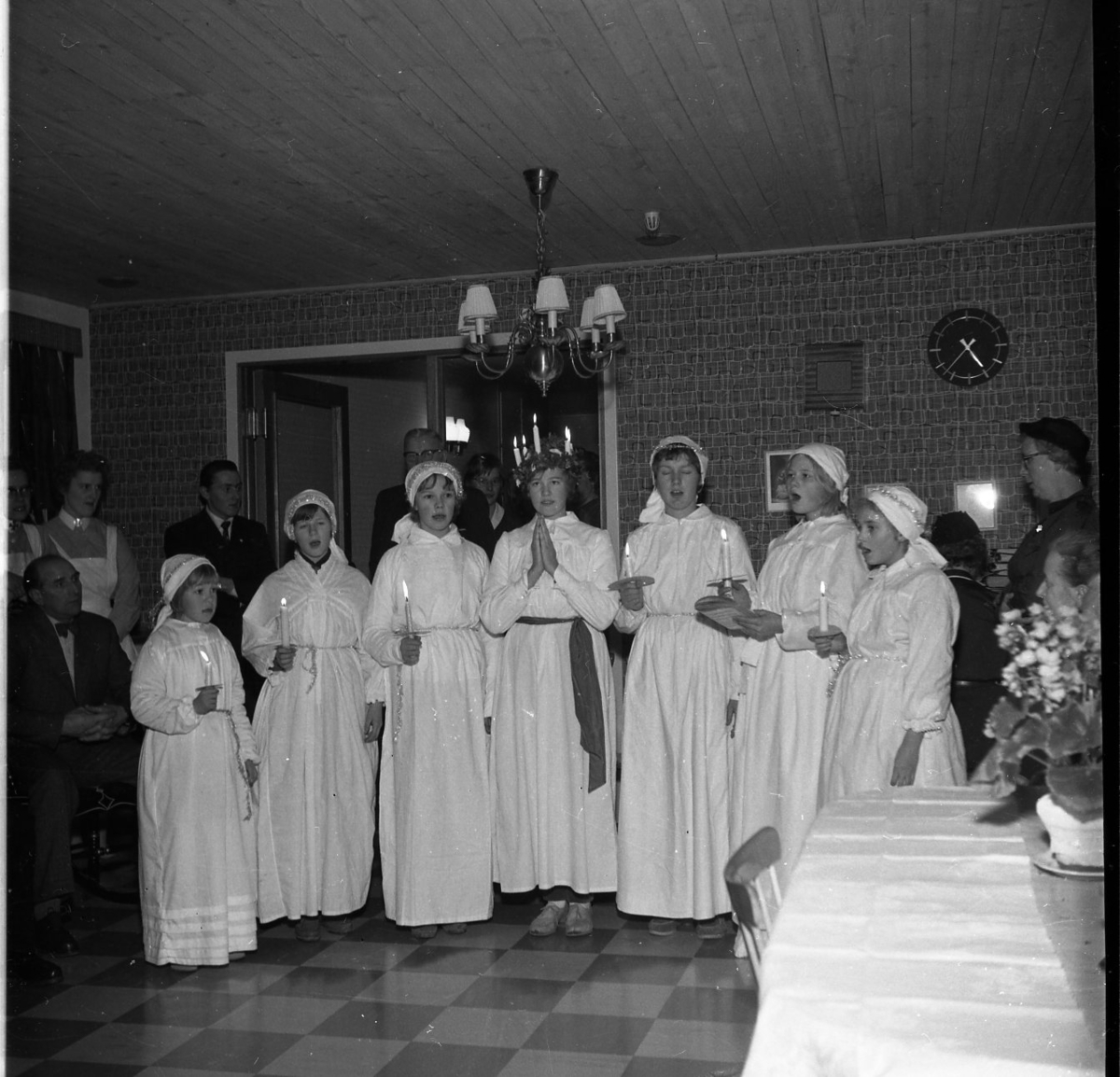 En luciakör står på golvet i en samlingslokal och sjunger. De bär vita skrudar och täcker håret med huvudduk. I mitten står lucian med en krona prydd av ris och levande ljus. Runt omkring dem sitter finklädda åhörare.