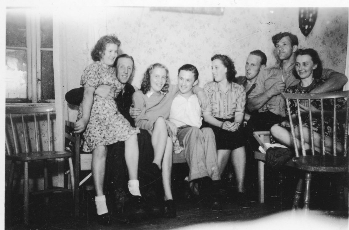 Ett glatt sällskap kvinnor och män sitter i en soffa.