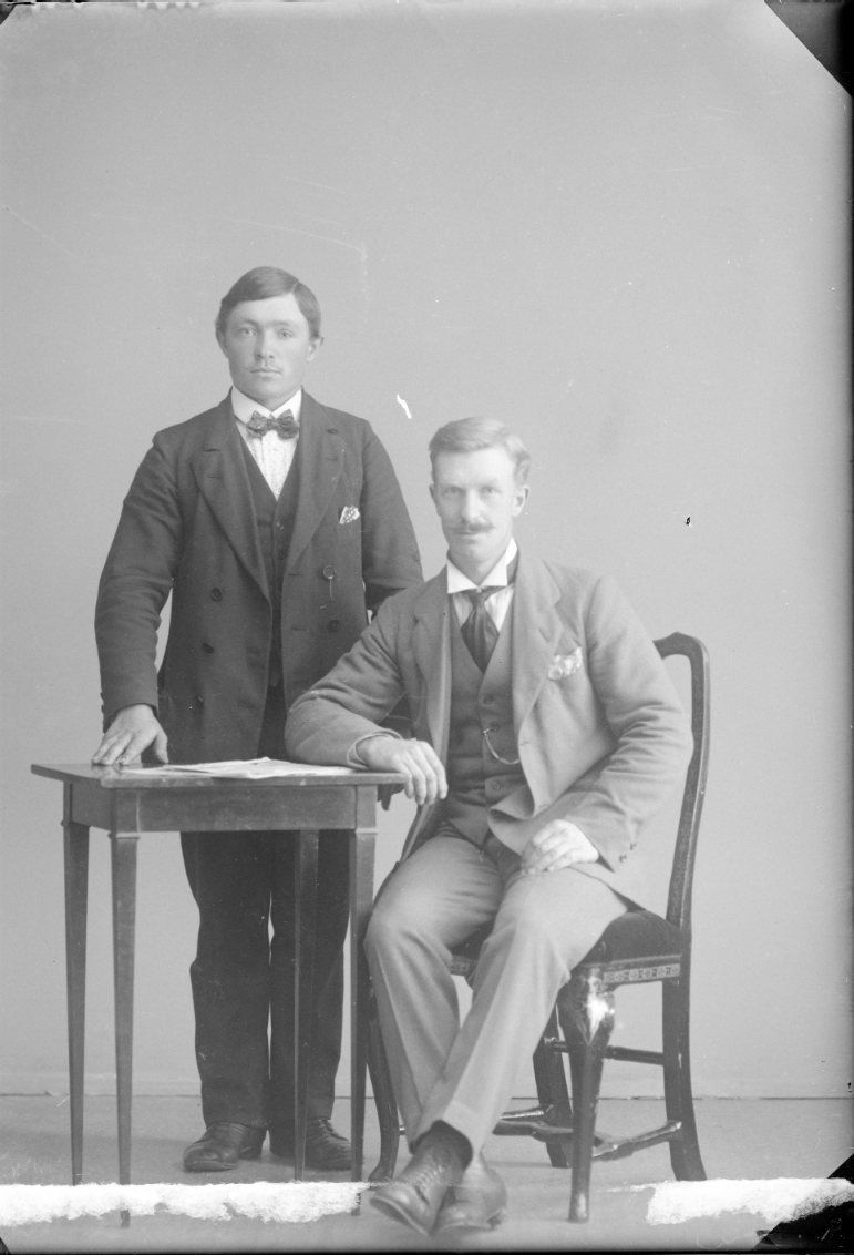 Porträtt av två yngre män, en sittande och en annan stående vid ett bord.