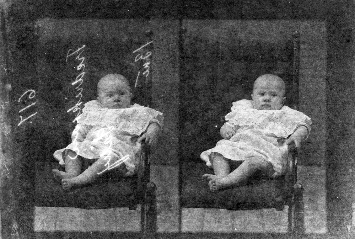 Porträtt av ett spädbarn som sitter i en stol. Två bilder på samma glasplåt.
