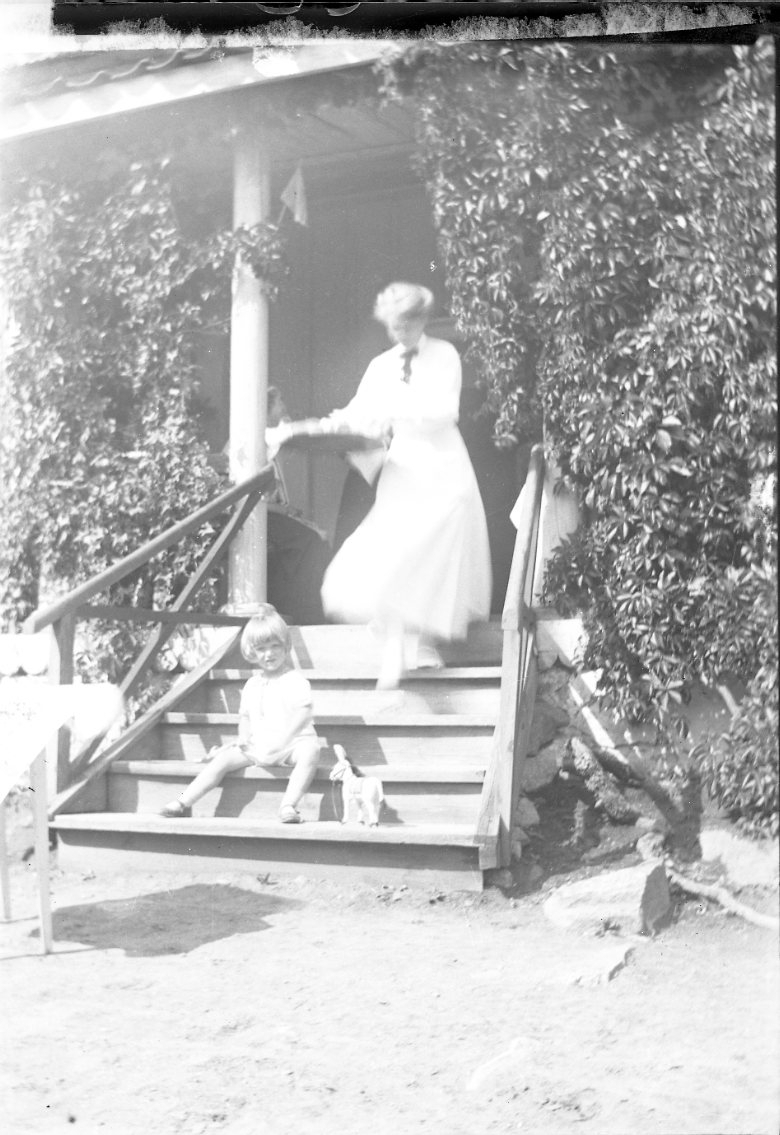 En kvinna går nerför en farstutrappa med en bricka i händerna. På nedre steget sitter ett barn med en leksakhäst. Det är sommar. Kvinnan är eller har anknytning till "friherrinnan Falkenberg" från Stockholm