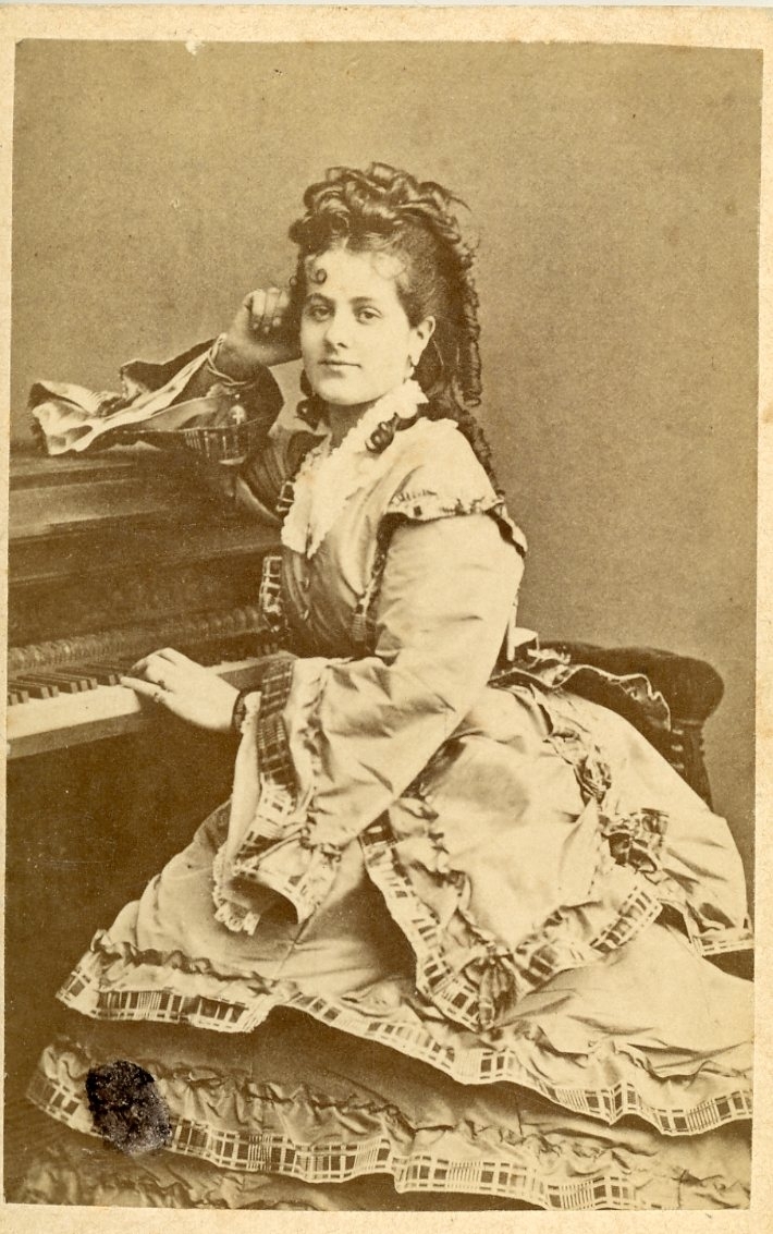 Kabinettsfotografi av en ung kvinna som sitter vid ett piano.