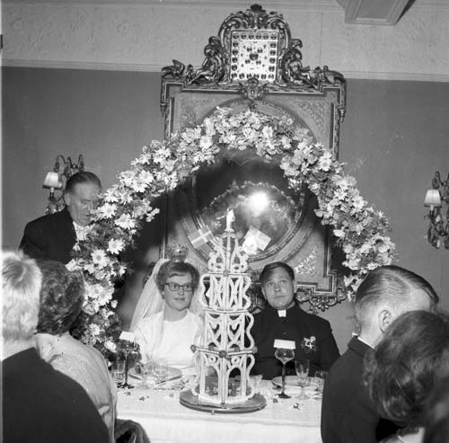 Ett brudpar sitter och lyssnar på ett tal av brudens far, kyrkoherde Wallis Wendel. Brudparet sitter i en portal av blommor.