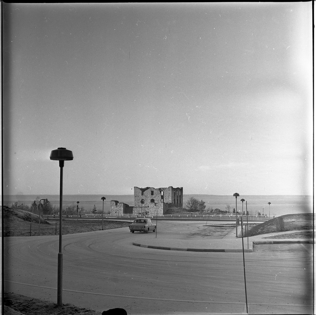 Brahehus slottsruin från rastplatsen öster om motorvägen.