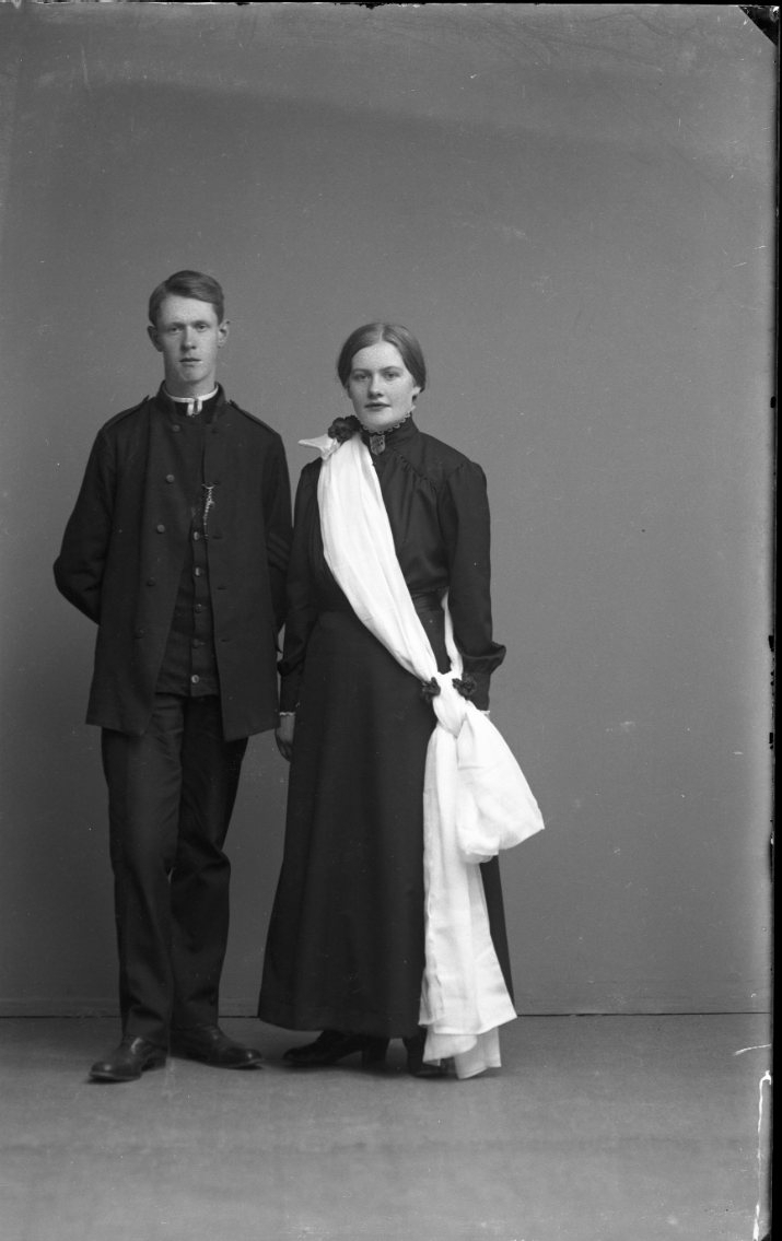 Brudparet Åkerberg. Hon har ingen krona däremot ett brett ljus band över axeln, knutet i midjan och hängande ner mot golvet.