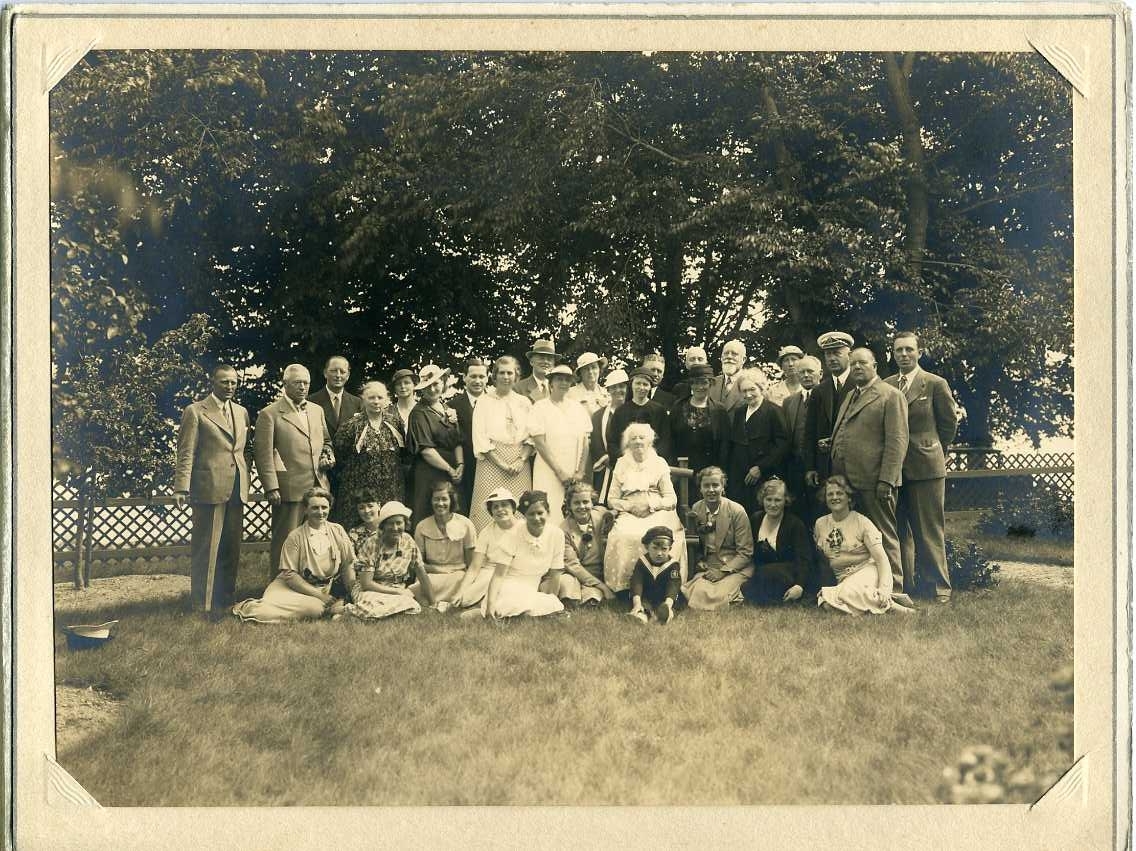 Gruppbild i en trädgård med finklädda kvinnor, män och barn. En äldre kvinna sittande i mitten.