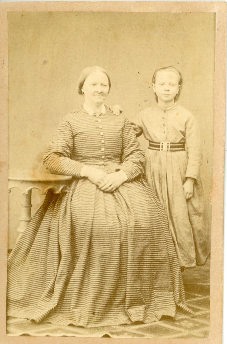 Kabinettsfotografi av en kvinna som sitter vid ett bord. En flicka står intill henne med sin högra arm på hennes vänstra axel. Det är mor och dotter.