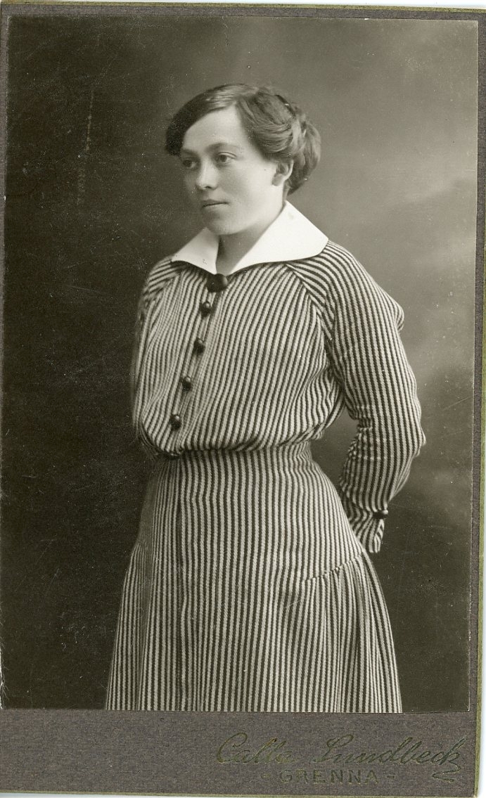 Kabinettsfotografi: en ung okänd kvinna i randig klänning med stora, mörka knappar vid bröstet.