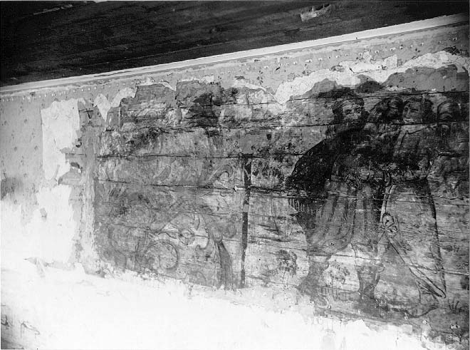 Målning på timmervägg från sent 1600-tal föreställande "Jakobs strid med ängeln". Målningen förstördes när huset revs tidigt 1900. Ett nytt hus var uppfört på samma plats 1916.