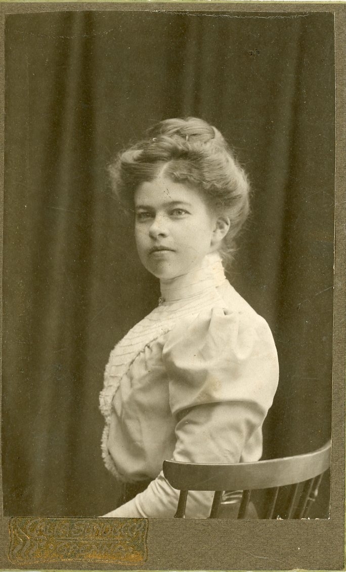 Kabinettsfotografi av en ung kvinna med håret uppsatt i en knut. Hon sitter på en stol.