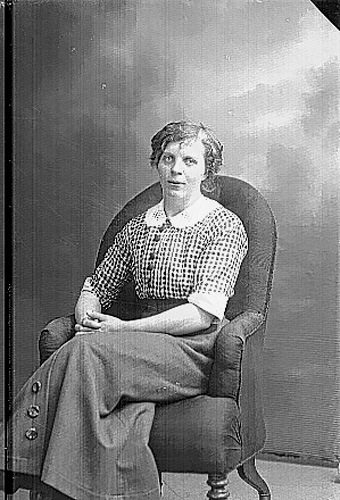 En kvinna i rutig blus och vit krage sitter i en fåtölj med händerna knäppta.