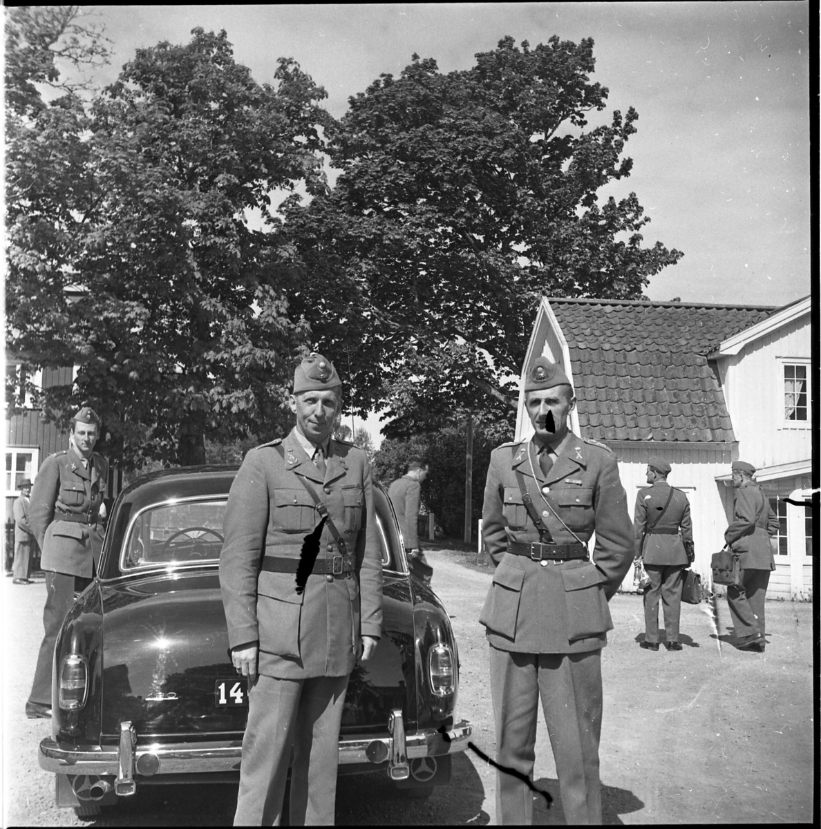Två uniformerade män. En har händerna bakom ryggen, den andre har händerna hängade längst med sidorna. I bakgrunden syns hus, träd och fler uniformerade män.