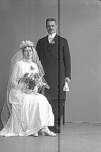 Ett brudpar. Bruden i vitt sitter på en stol.