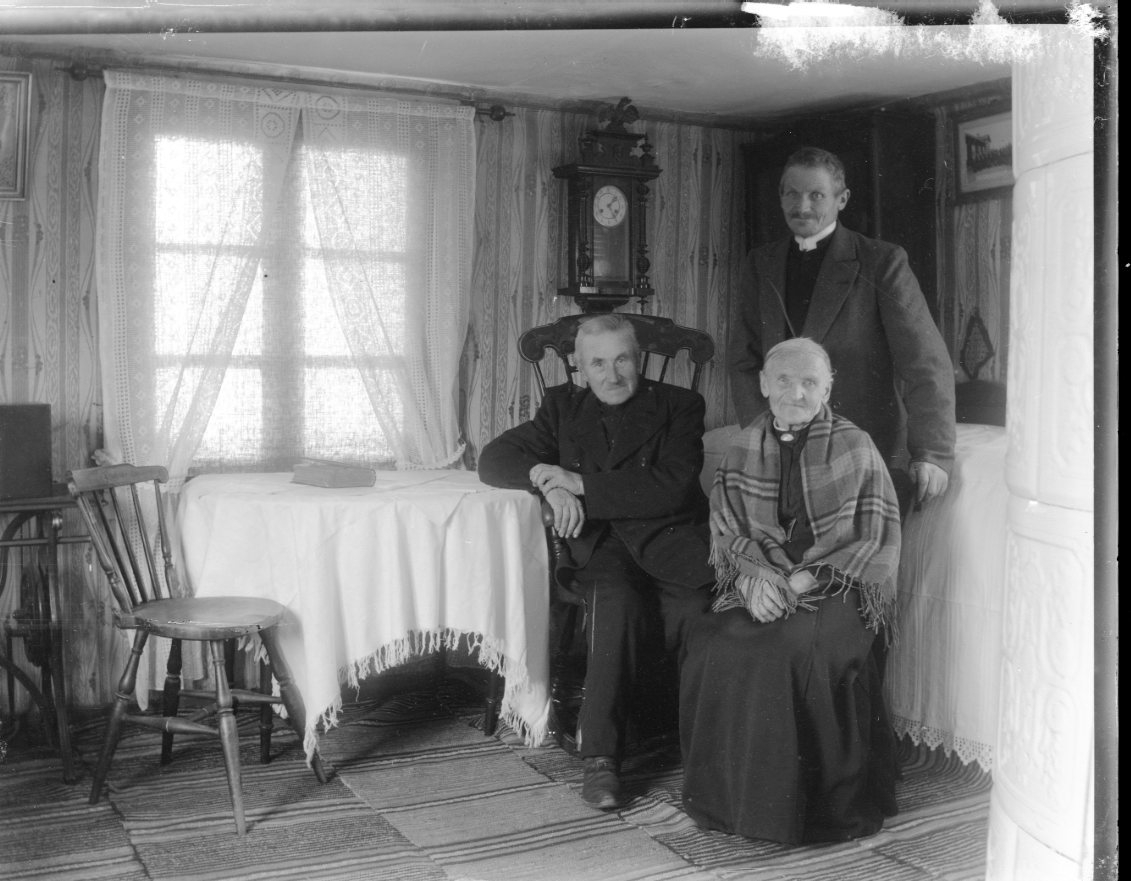 Ett äldre par sitter vid ett bord, en något yngre man står bakom dem. Kvinnan har en rutig sjal om axlarna. Det är lågt i tak. En väggklocka bakom dem.