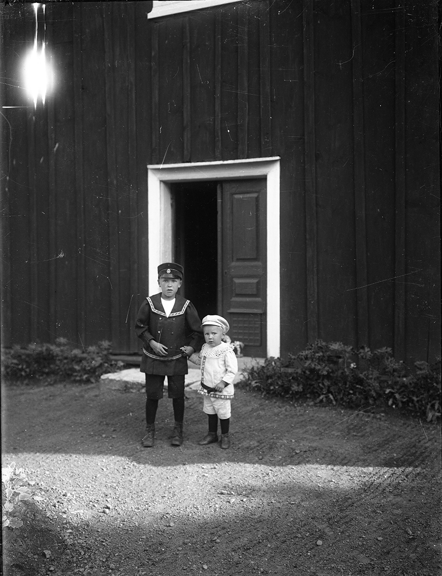 Två små barn på en grusplan framför ett hus med en öppen dörr. Grusplanen ligger delvis i skugga.