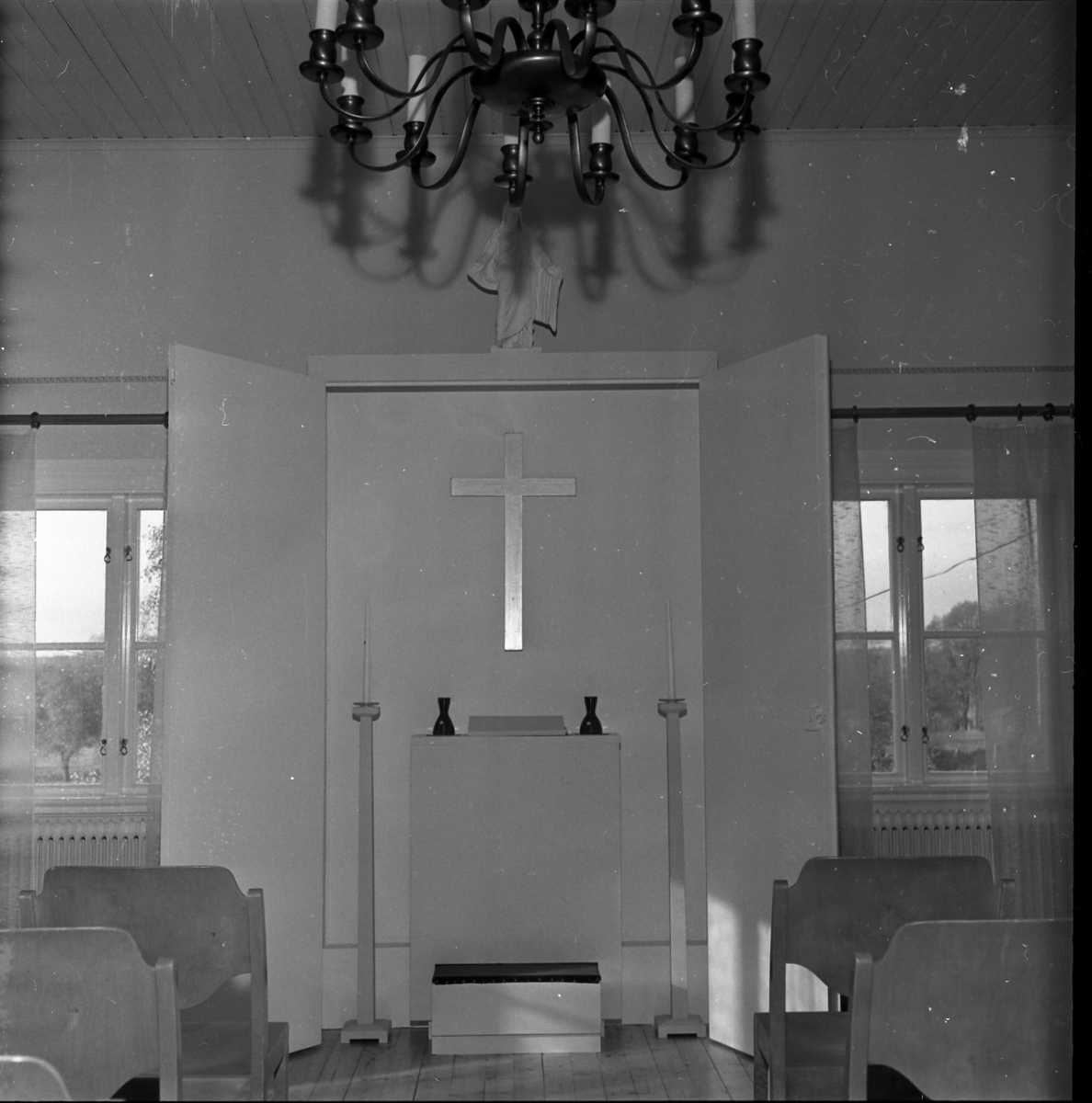 Ett altare med en Jesus-statyett ovanpå. Det är fönster på varje sida av altaret. Det hänger ett trumfkrucifix i silver ovanför altaret.