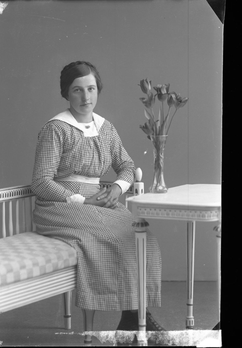 En ung kvinna i smårutig klänning sitter i en soffa vid ett bord med en vas med blommor.