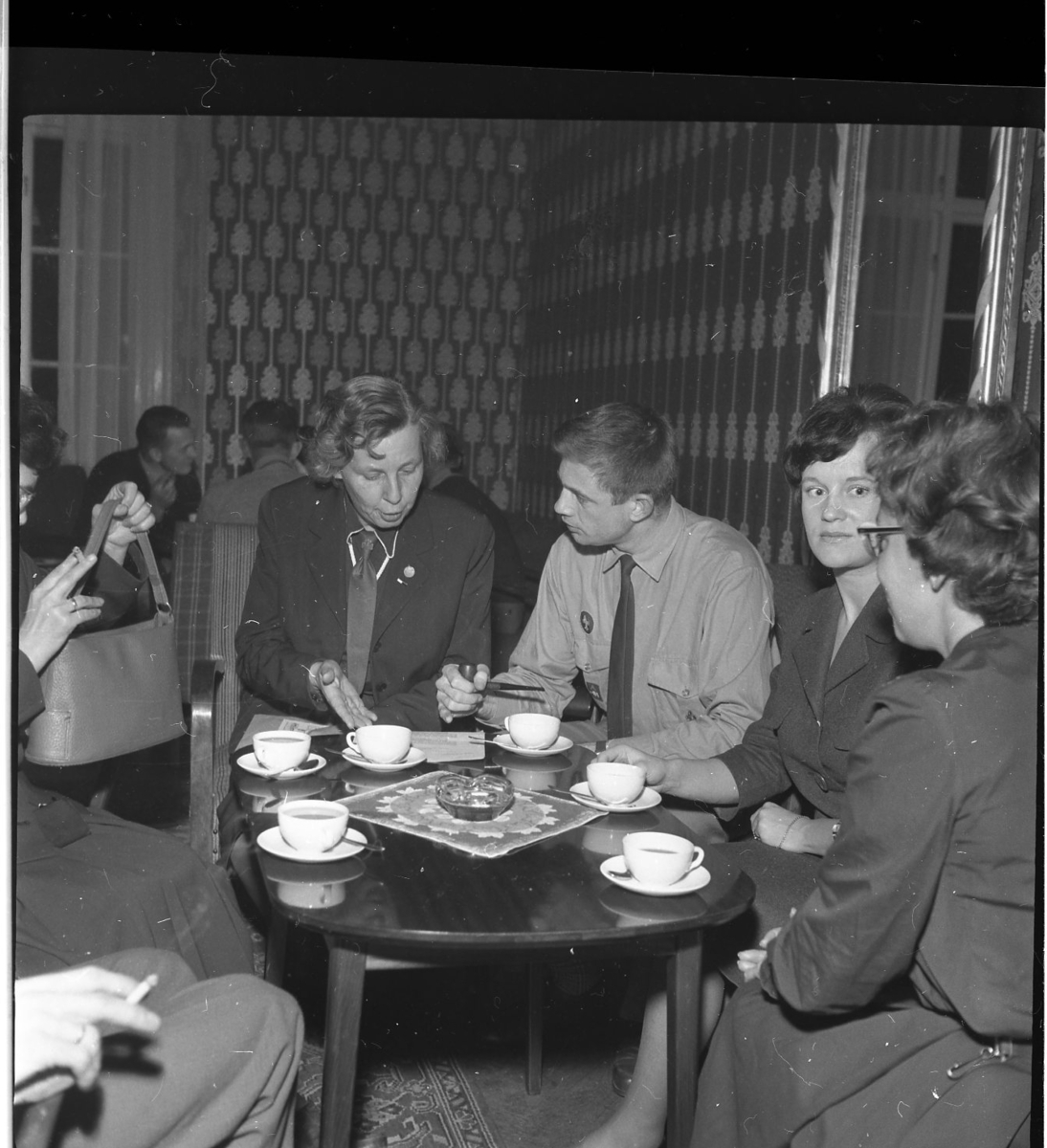 Män och kvinnor, en del i scoutdräkt, sitter i grupper runt bord med kaffekoppar och cigaretter.