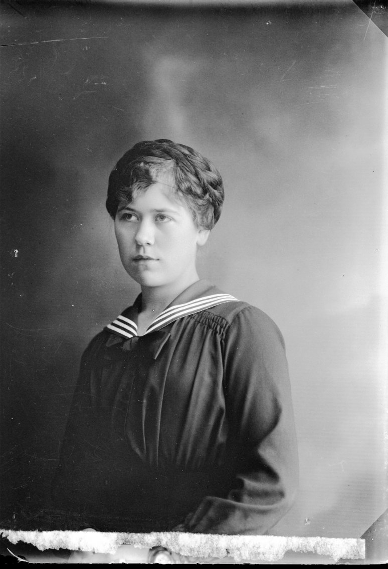 Porträtt av en ung kvinna med fläta i håret. Hon har klänning med sjömanskrage.