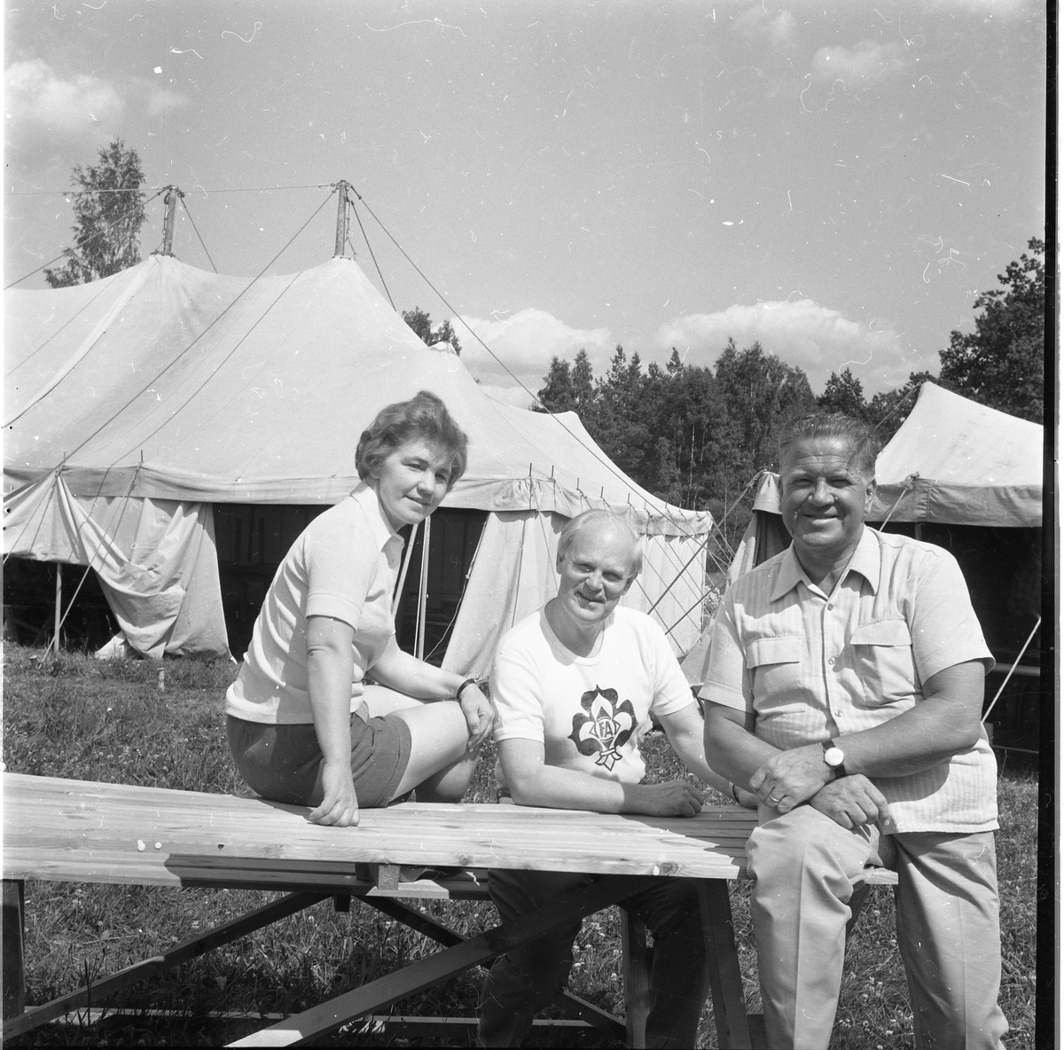 En kvinna och två män sitter vid en utemöbel på en gräsplan framför ett stort tält.