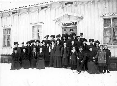 En grupp på 33 män, kvinnor och barn står uppställda i vinterkläder på trappan till Uppgränna Mattsagård. Det är vinter och snö på marken.