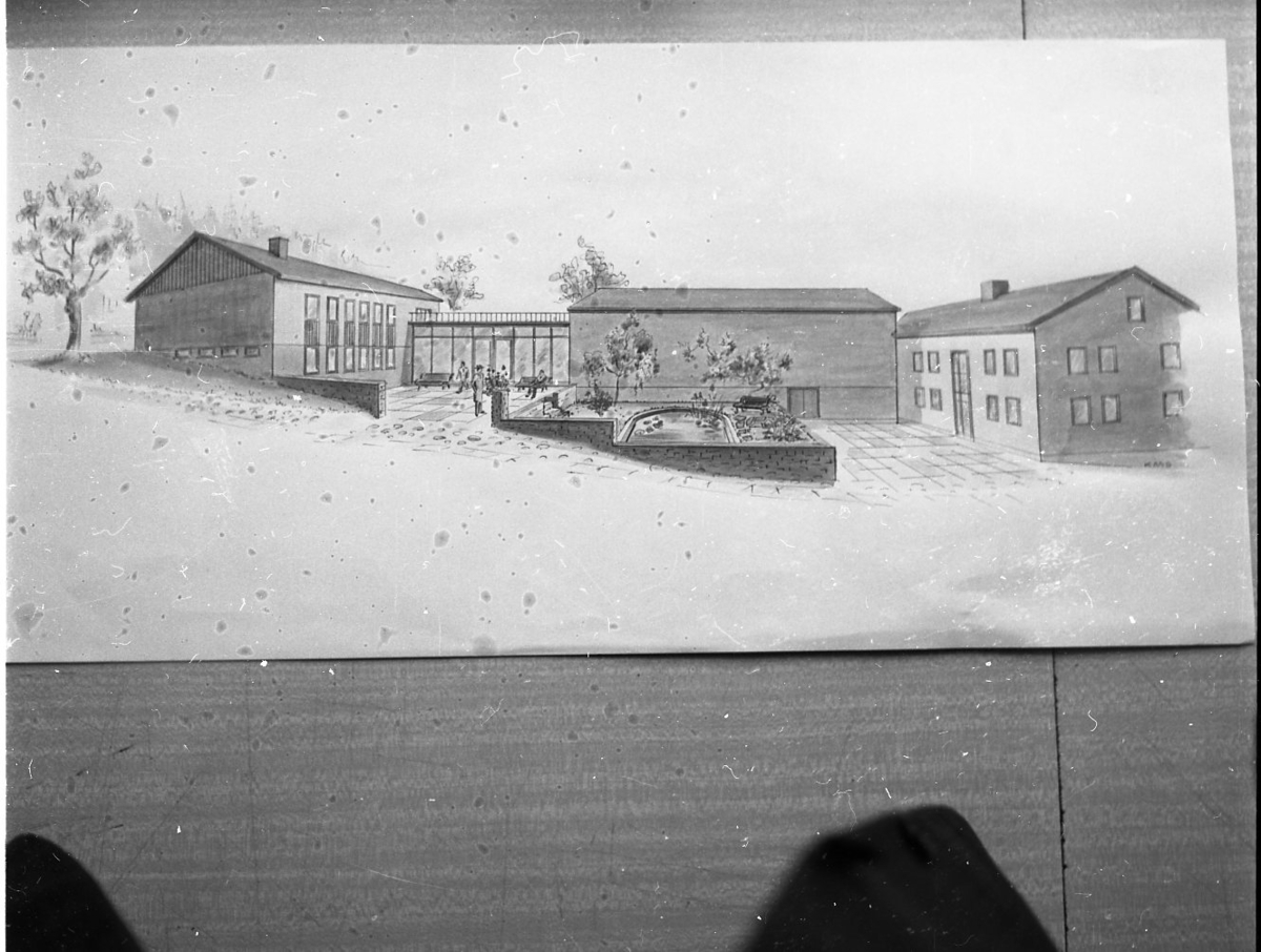 En tavla hänger på en betongvägg. Målningen föreställer en innergård omgiven av hus. Mitt på gården står en fontän. Möjligen föreställande södra delen av Gränna torg med ombyggnadsförslag av kvarteret Hjorten.