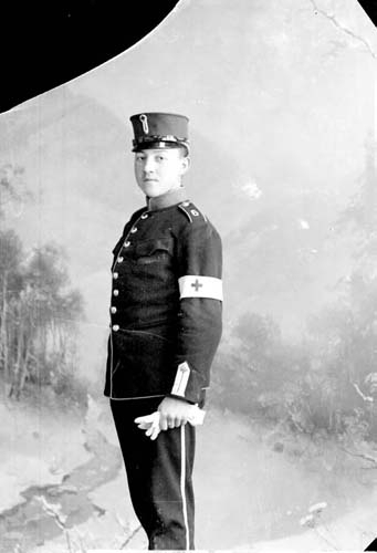 En man i militär uniform stående i 3/4-profil. En vit band med kors på vänster arm.
