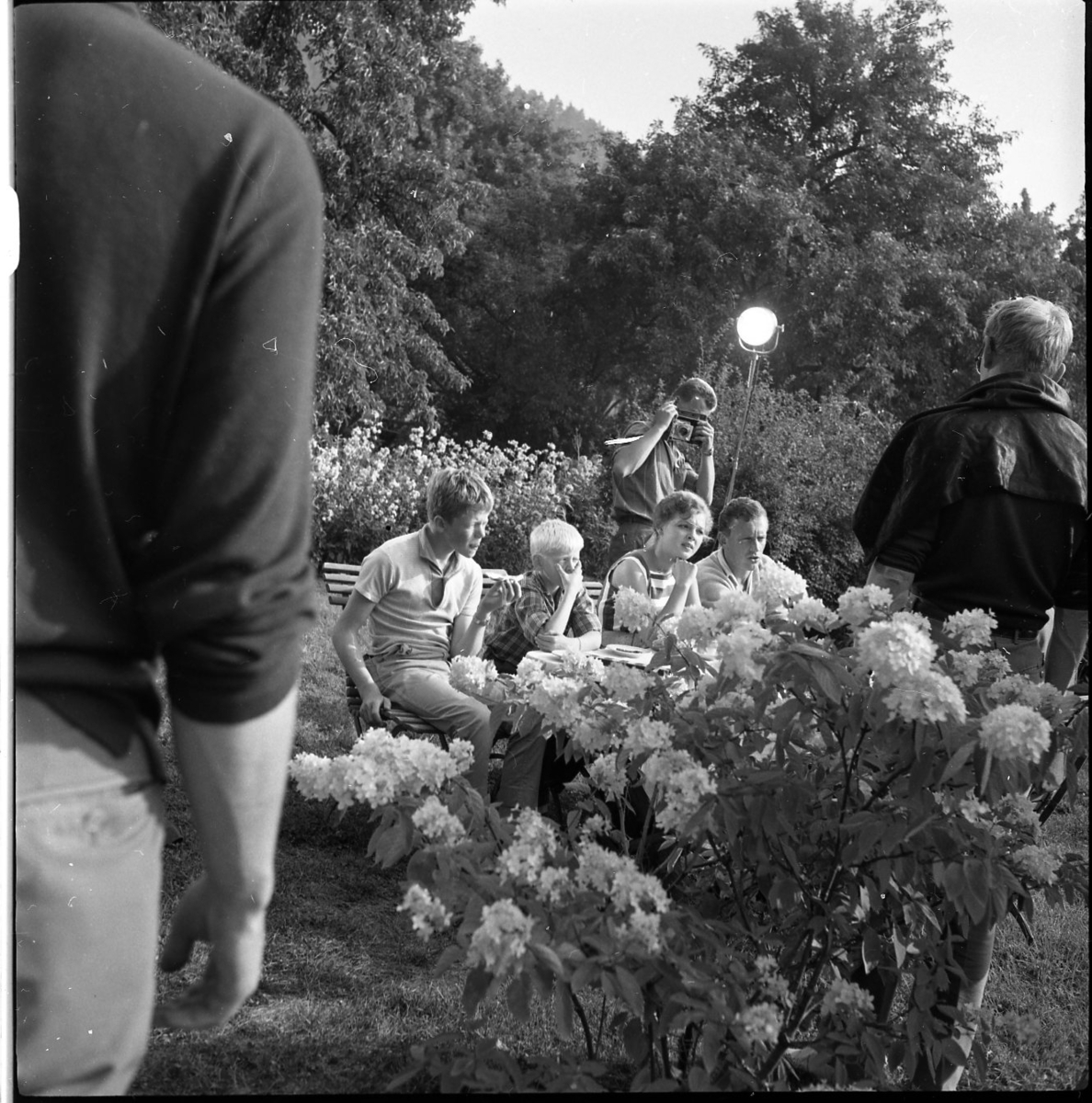 En man, en kvinna och två pojkar sitter vid ett trädgårdsbord i en trädgård. De har dukar upp kaffekoppar och fat. Runt omkring dem står tre personer varav en håller i en kamera.