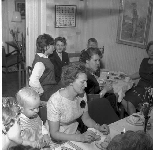 Flera personer sitter och dricker kaffe och pratar. En liten bebis sitter med vid bordet.