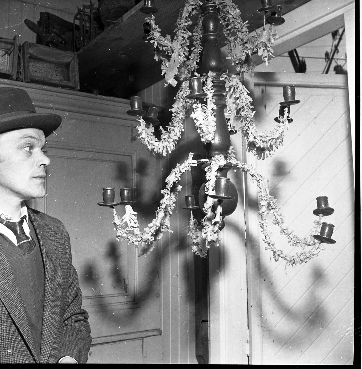 En man med hatt står vid en upphängd med fransat papper dekorerad ljuskrona.