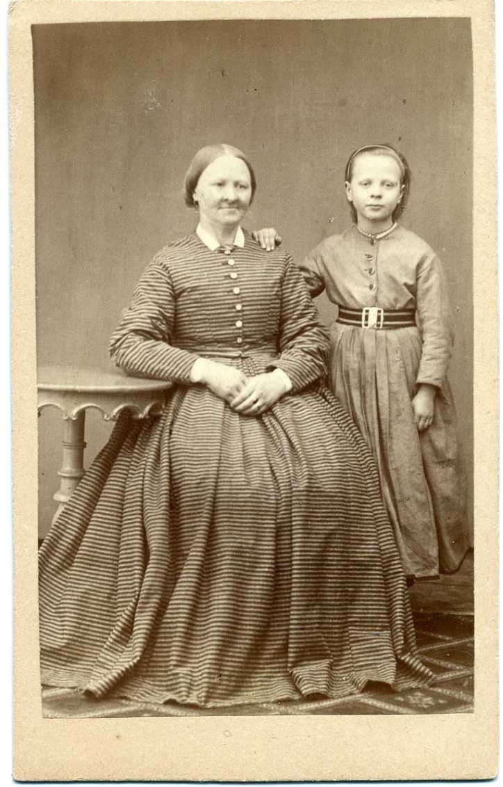 Kabinettsfotografi: sockerbagaren, polkagristillverkaren Amalia Erikson sittande på en stol med dottern Ida Amalia stående vid sin sida.