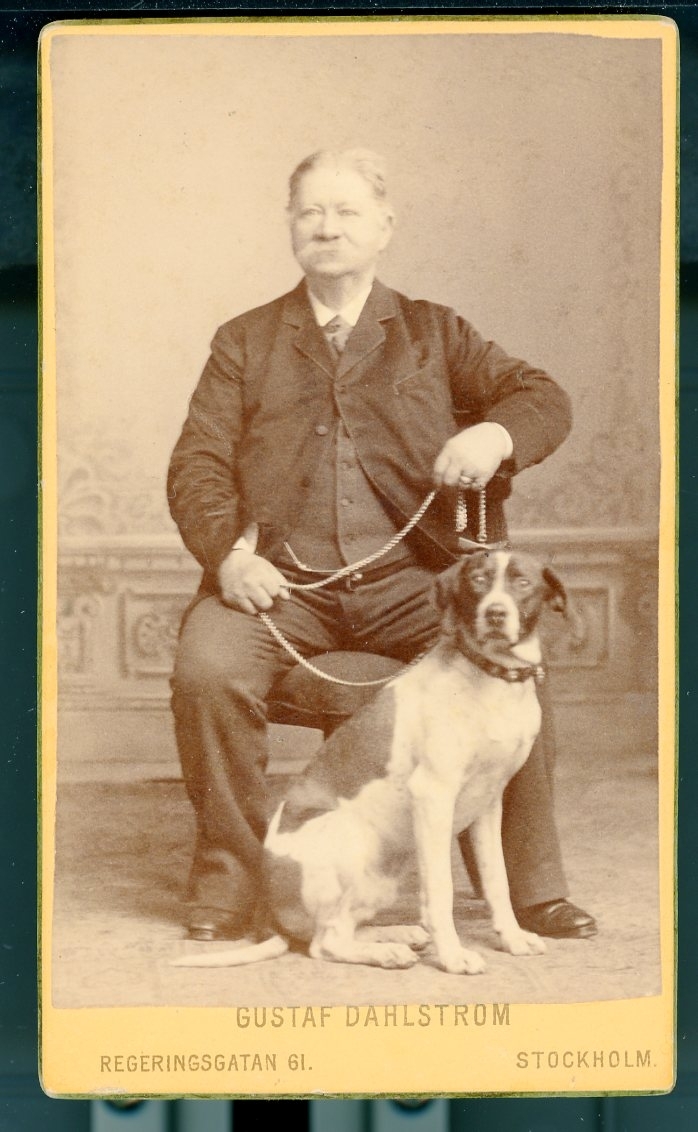 Kabinettsfotografi: J G Hall sittande på en stol med en hund i koppel.